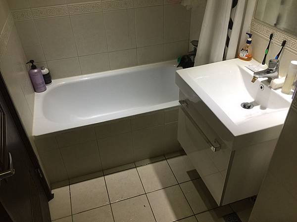 浴缸拆除、保留30%當置物台 原有洗臉盆地板排水改成牆壁排水